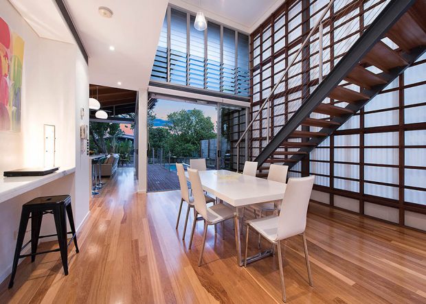 ภายในตกแต่งในสไตล์ โมเดิร์นลักเซอรี่ ผนังสีขาวปูพื้นด้วยไม้ลามิเนตสีอ่อน ส่วนเพดานนั้นเน้นความอบอุ่นจากสเน่ห์ของงานไม้ด้วย ทำให้บ้านดูอบอุ่นและกลมกลืนกับบรรยากาศรอบข้างได้เป็นอย่างดี